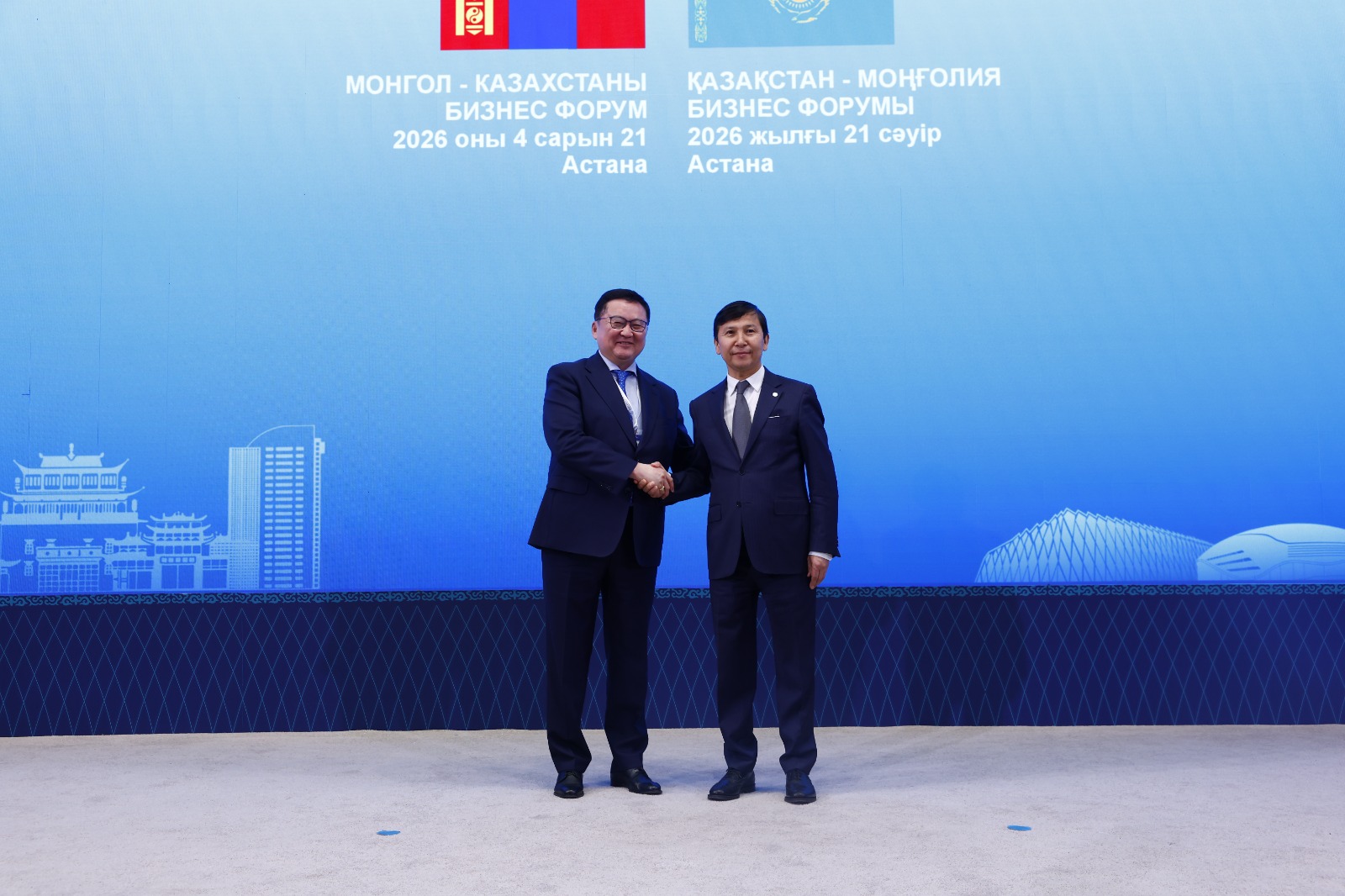 21 апреля 2026 года в городе Астана состоялся Казахстанско-монгольский бизнес-форум с участием Заместителя Премьер-Министра – Министра национальной экономики Республики Казахстан Серика Жумангарина и Первого заместителя Премьер-министра – Министра экономики и развития Монголии Жадамбын Энхбаяра. Соорганизатором мероприятия выступила Внешнеторговая палата Казахстана.