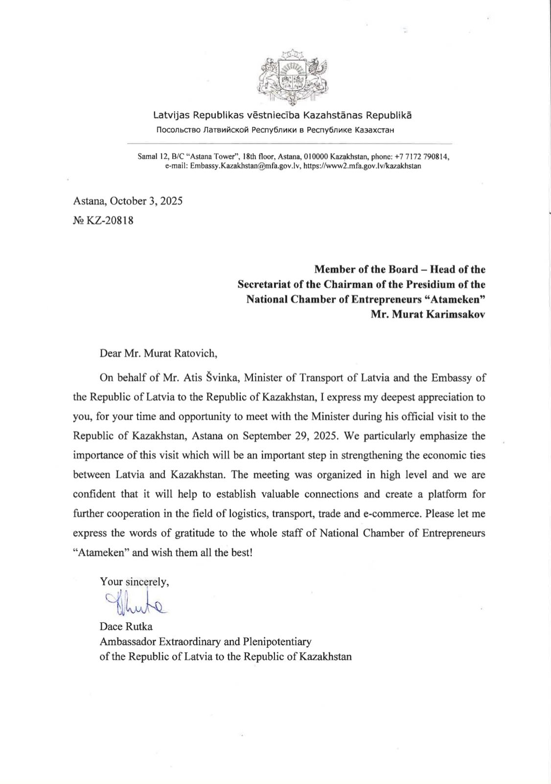哈萨克斯坦国际贸易商会董事会主席穆拉特·卡里姆萨科夫(Murat Karimsakov)收到来自拉脱维亚共和国交通部长阿蒂斯·什温卡(Atis Švinka)及拉脱维亚驻哈萨克斯坦大使馆的感谢信。