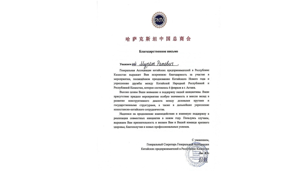 在庆祝中国新年暨推动哈中经贸合作发展的会议结束后,哈萨克斯坦对外贸易商会董事会主席穆拉特·卡里姆萨科夫先生荣获哈萨克斯坦共和国中国企业家总协会颁发的荣誉证书。