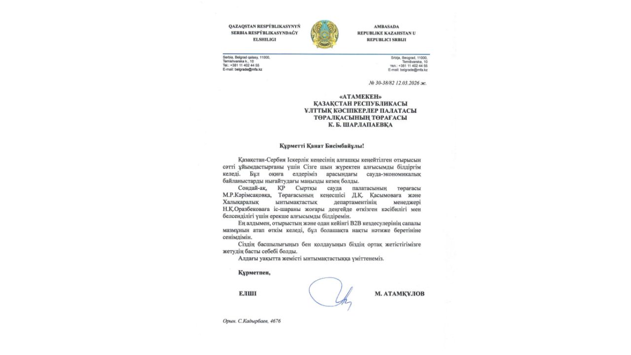 哈萨克斯坦对外贸易商会收到哈萨克斯坦驻塞尔维亚共和国大使馆的感谢信,以表彰2026年2月26日在阿斯塔纳举行的哈萨克斯坦-塞尔维亚商务理事会首次扩大会议及商务论坛的成功举办。