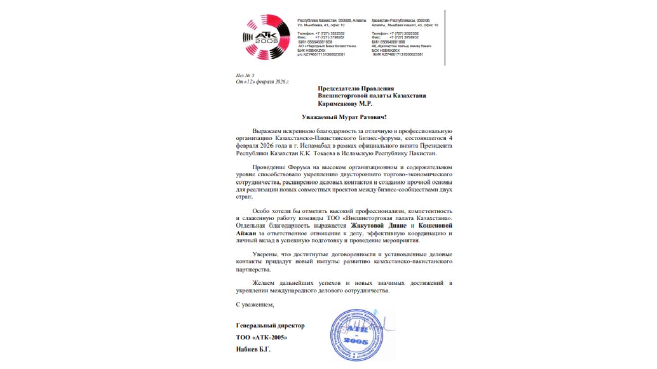 2026年2月4日,在哈萨克斯坦共和国总统卡西姆-若马尔特·托卡耶夫对巴基斯坦伊斯兰共和国进行正式访问期间,于伊斯兰堡举行了哈萨克斯坦—巴基斯坦商务论坛。论坛结束后,“ATK-2005”有限责任公司向哈萨克斯坦对外贸易商会董事会主席穆拉特·卡里姆萨科夫先生致以感谢信。